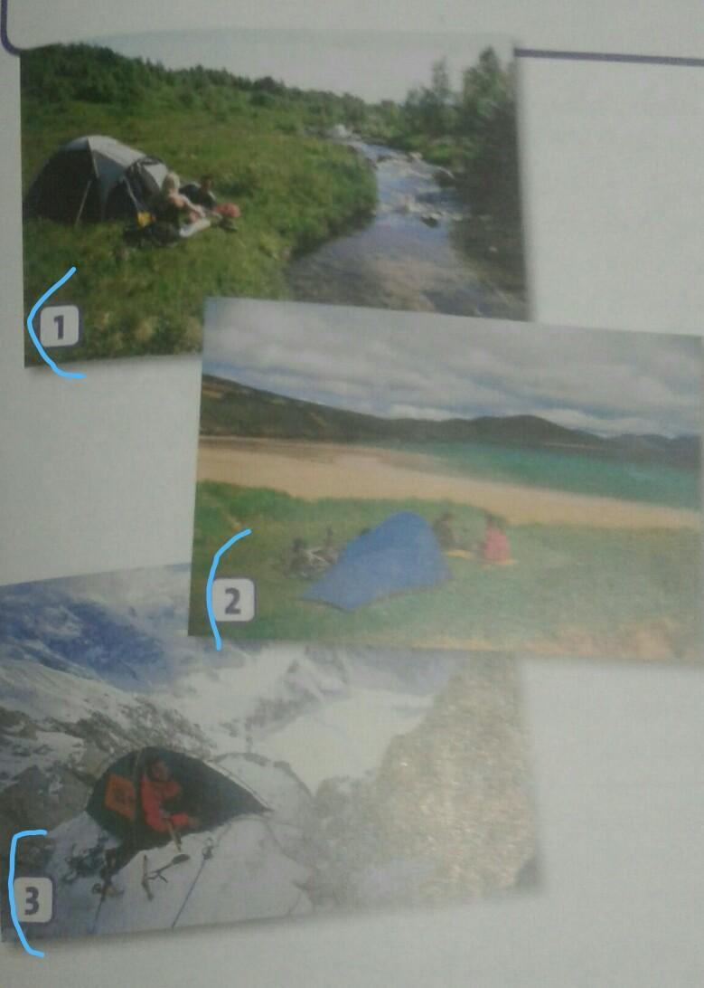 the first and second photos show that people have set up tents, which means they went on a hike for 3 photos, a person also set up a tent, but in a winter location it means that he is either on a mountain or in a winter place
