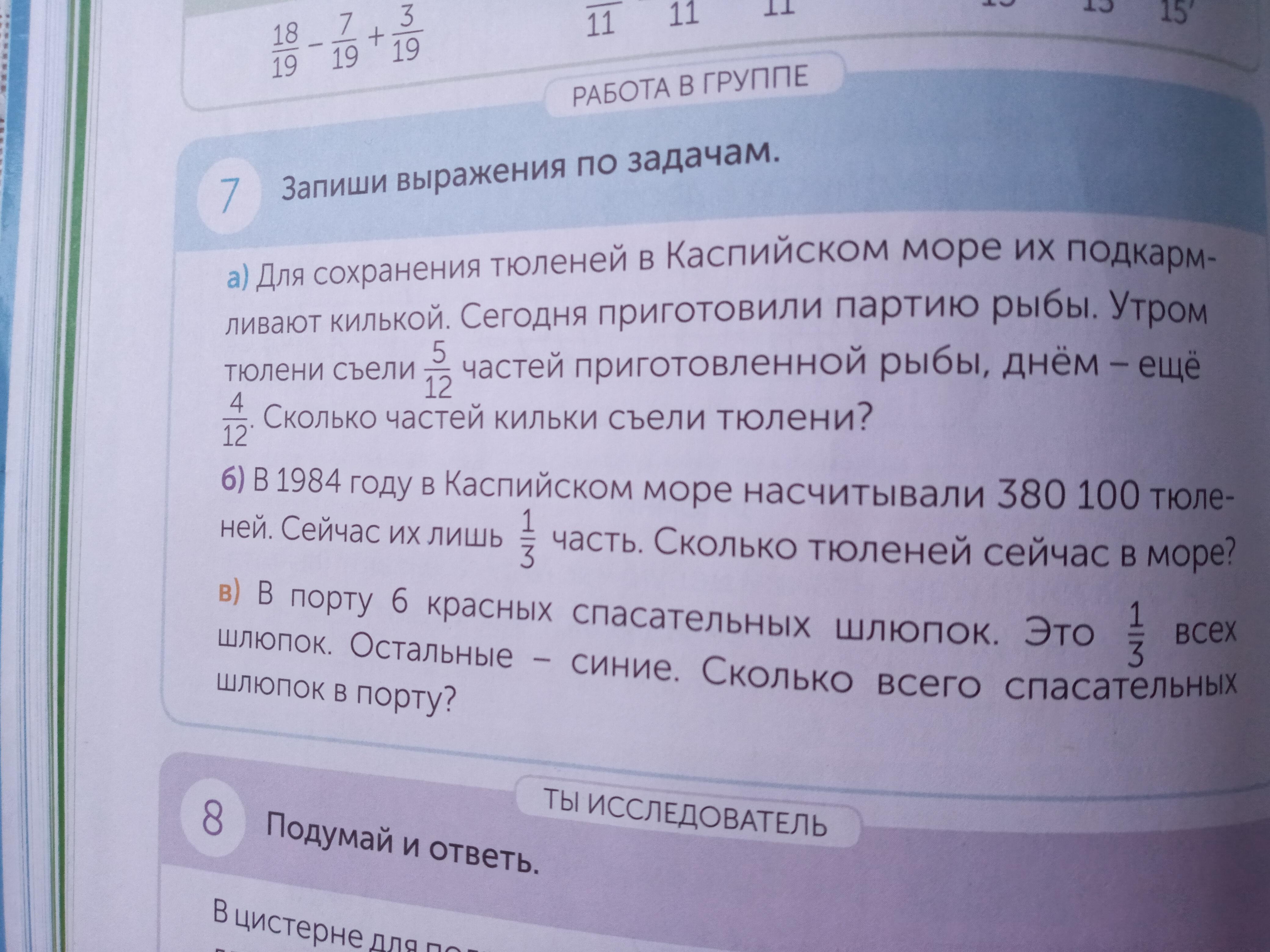 1) 5/12+4/12=9/12=3/4(съели тюлени за день)