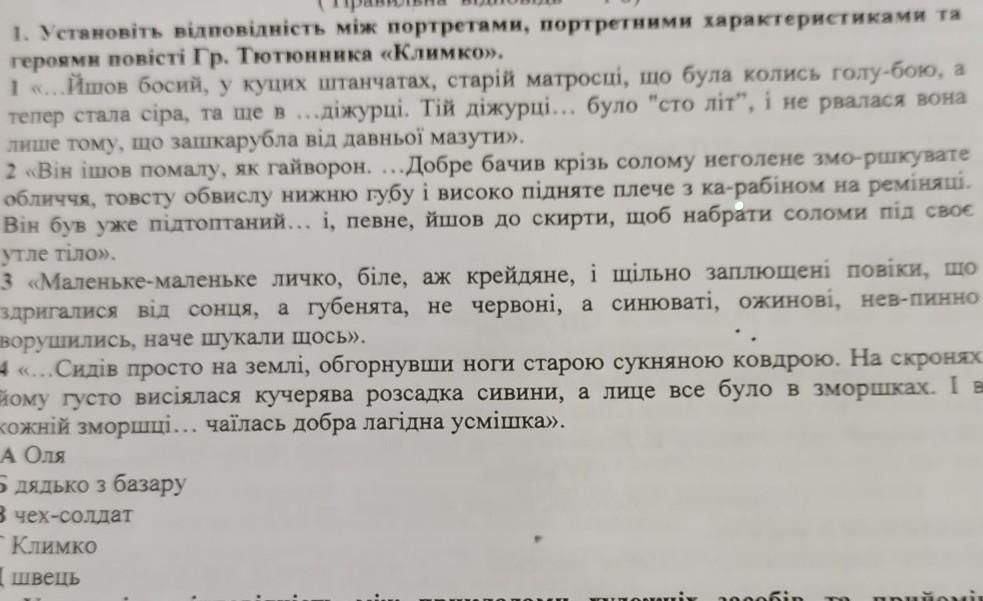 Установіть відповідь між портретами, портретними характеристиками та гуроями повісті Гр. Тютюнник а "Климко"