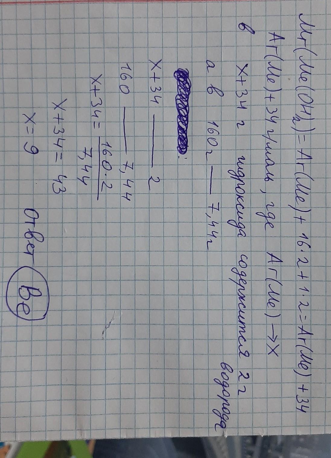 В 160 г гидроксида двухвалентного металла содержится 7,44 г водорода. Какой металл входит в состав гидроксида? Произведи необходимые расчёты и запиши русское название металла.