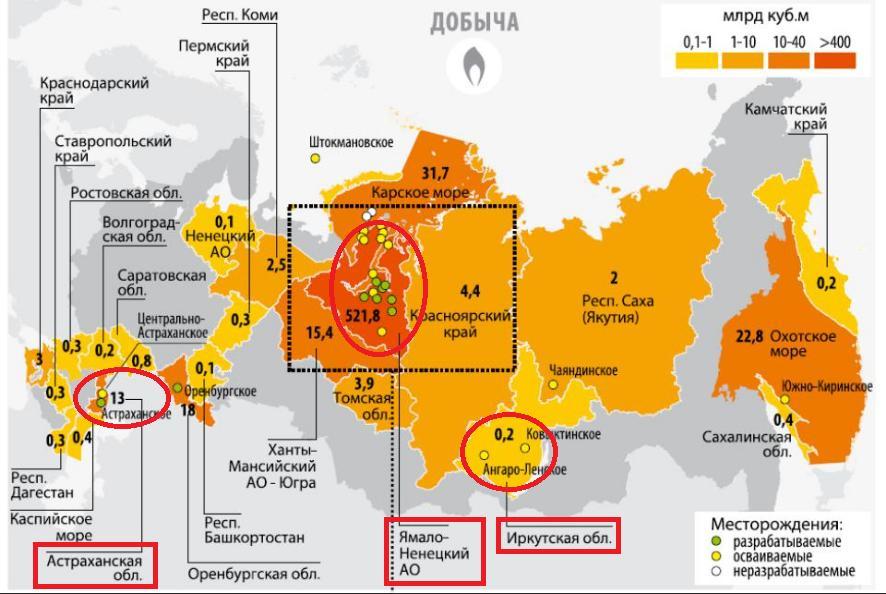 Как видно из карты, которая дана ниже в приложении, добыча природного газа ведётся в Ненецком АО, Астраханской области и Иркутской области.