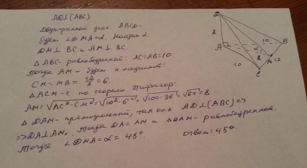 В тетраэдре DАВС ребро АD перпендикулярно к плоскости АВС, АС=АВ=10 см, ВС=18см, АD=12см. Найдите линейный угол двугранного угла АВСD.