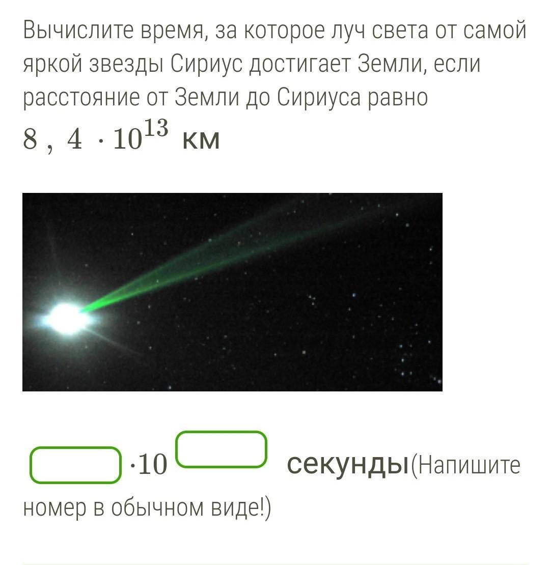 Вычислите время, за которое луч света от самой яркой звезды Сириус достигает Земли, если расстояние от Земли до Сириуса равно 8 , 4 ⋅1013км