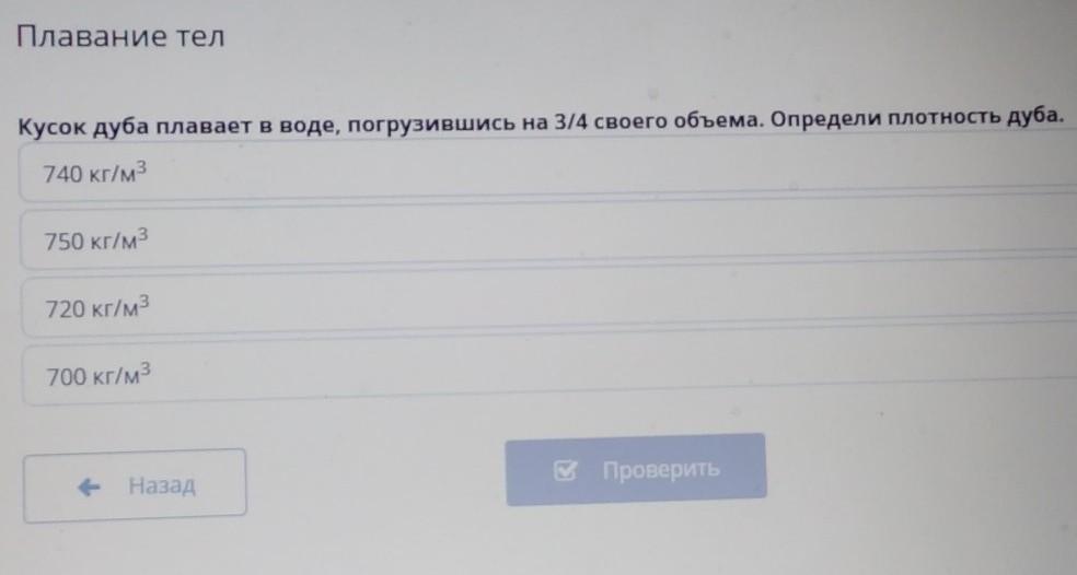 Кусок дуба плавает в воде, погрузившись на 3/4 своего объема. Определи плотность дуба,