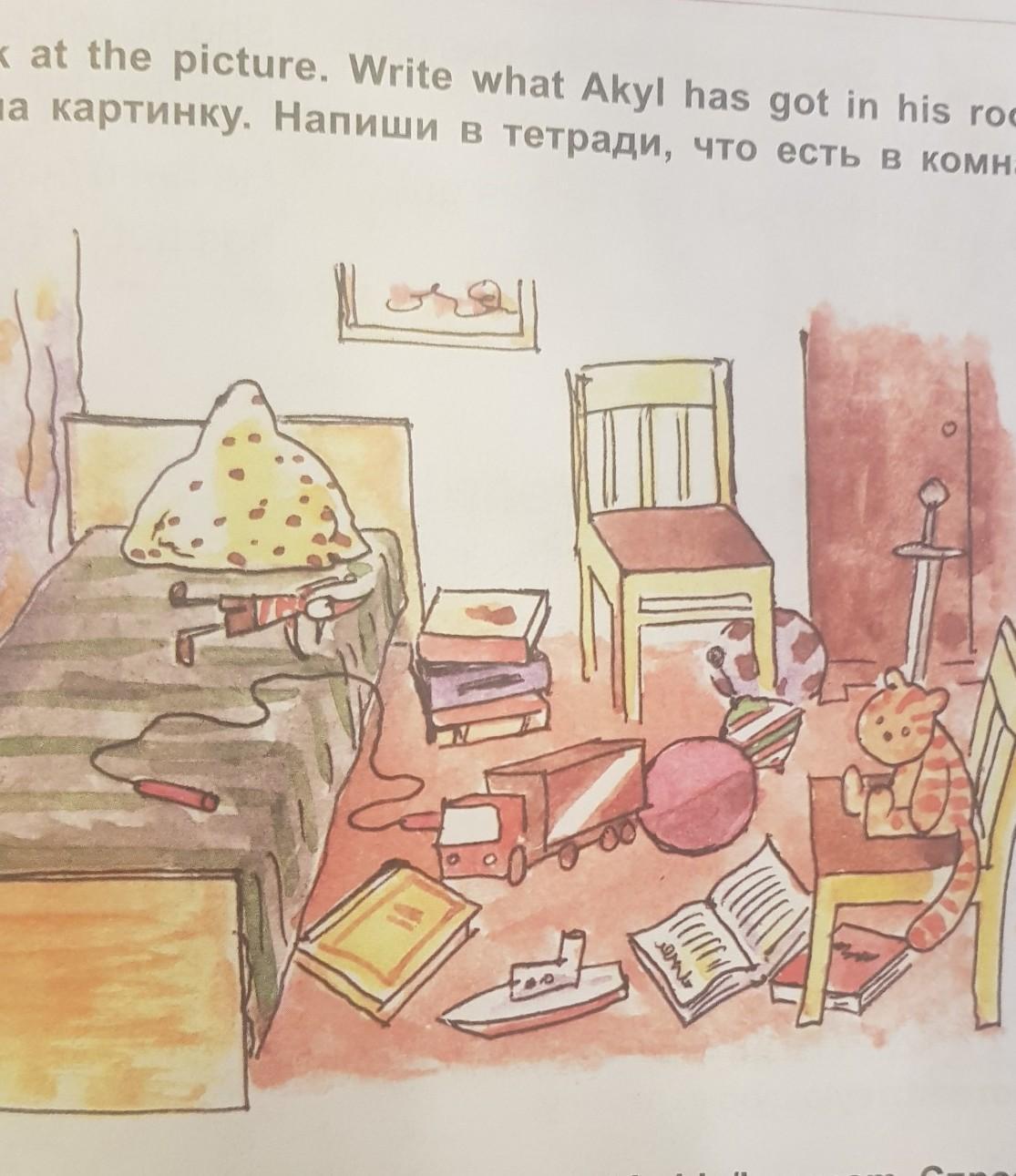 Ответ Akyl has got a skipping rope and a buratino on his bed. He has got a car, a ship, a ball, a copybook, a top and some books on the floor. He has got a toy tiger on the chair. He has got a sword near the wardrobe.
