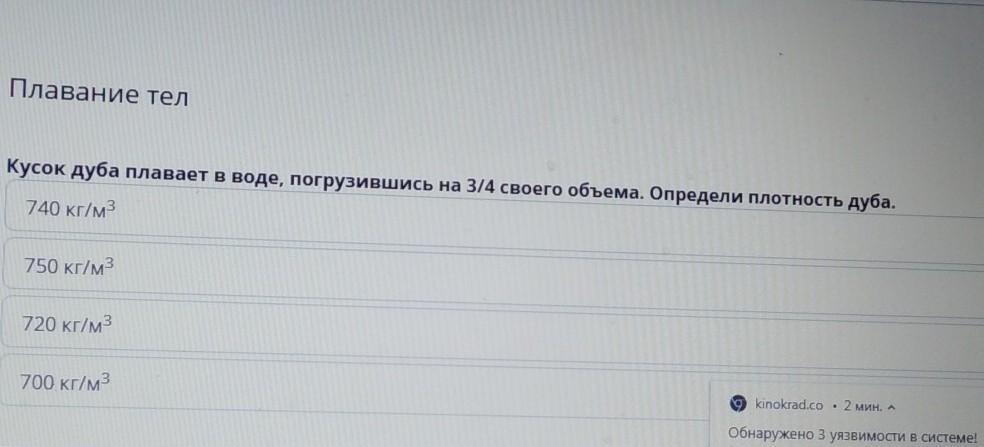 Кусок дуба плавает в воде, погрузившись на 3/4 своего объема. Определи плотность дуба,