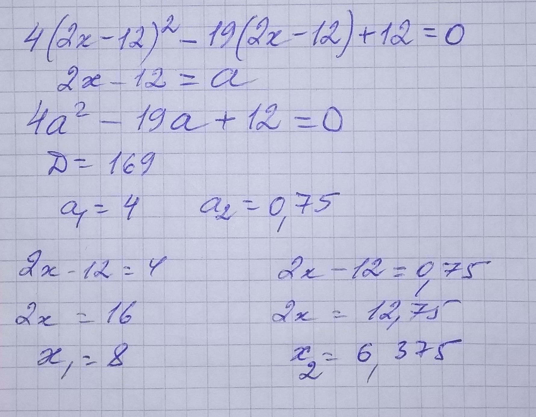 Реши квадратное уравнение 4(2x−12)2−19(2x−12)+12=0
