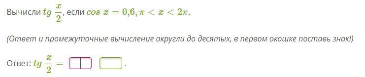2)tgx/2=√((1-cosx)/(1+cosx))=√((1-0.6)/(1+0.6))=√0.25=0.5