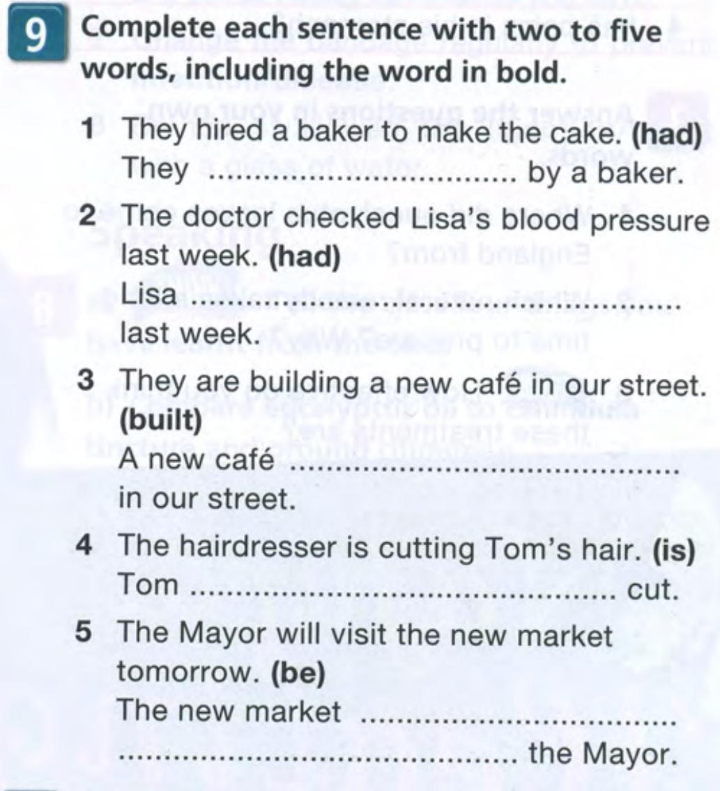 4. The hairdresser is cutting Tom's hair. (is) Tom ... cut.
