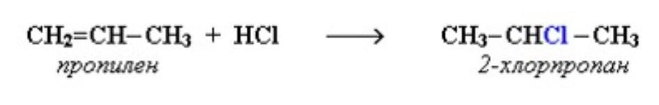 Пример реакции, протекающей по правилу Марковникова изображен на картинке