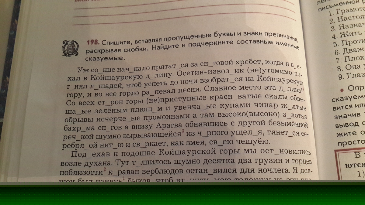 солнце начинало прятаться за снеговой хребет; выехал в долину; осетин-извозчик неутомимо погонял лошадей; взобраться; распевал; долина; сторон горы, неприступные красноватые скалы, обвешанные зелёным плющом и увенчанные купами чинар жёлтые обрывы, исчерченные промоинами, а там высоко-высоко золотая бахрома снегов, а внизу Арагва, обнявшись с другой; речкой, шумно вырывающейся из чёрного ущелья, тянется серебряной нитью и сверкает; своею чешуёю.