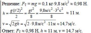 брошенный вертикально вверх мяч массой 100 г вернулся на землю через 3 с.Определите скорость мяча,силу тяжести,действующую на мяч и импульс в момент падения