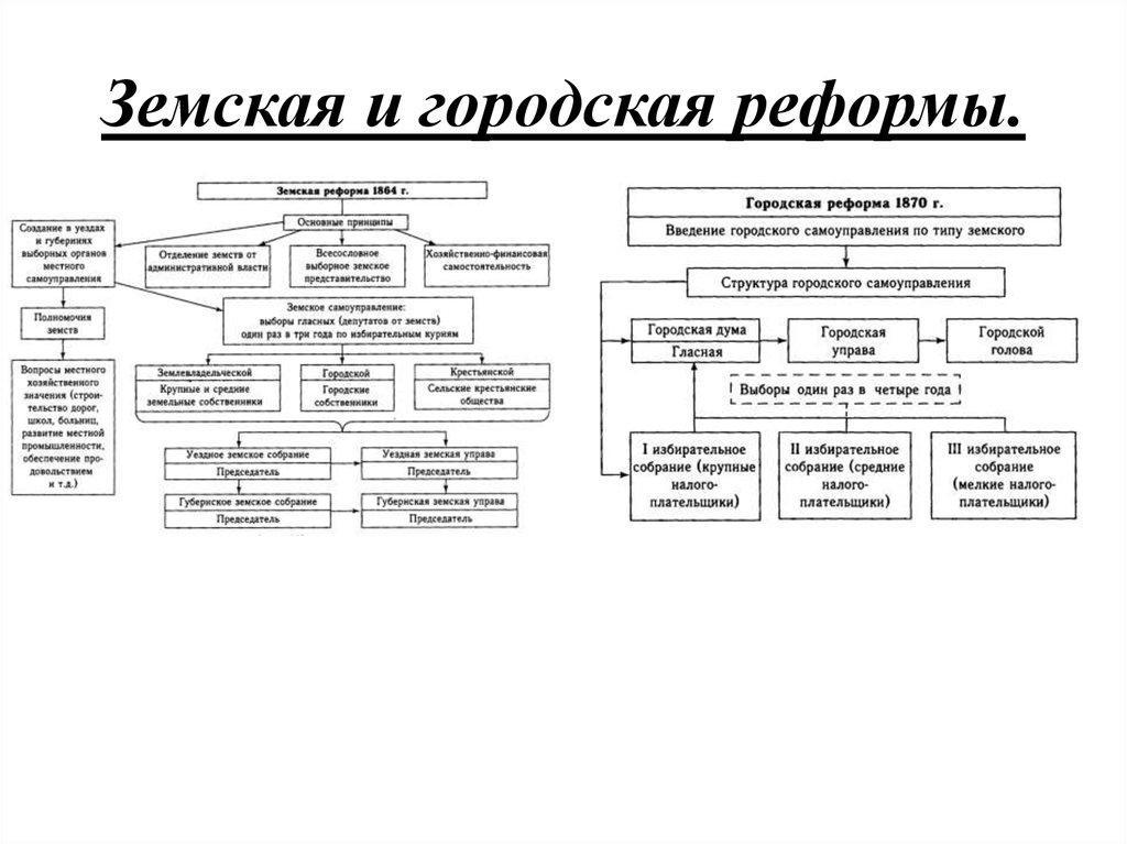 Схему, представляющую организацию земского и городского управления в пореформенной России, найдете ниже.