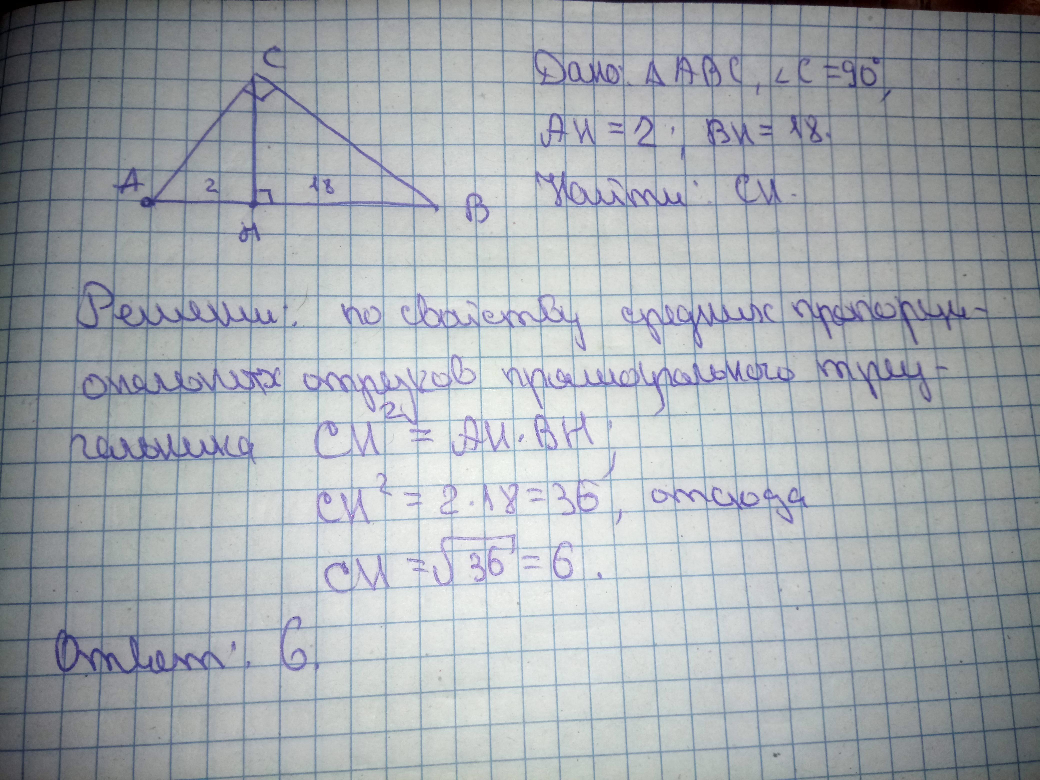 Проекции катетов на гипотенузу прямоугольного треугольника равны 2 и 18. Найдите высоту треугольника опущенную на гипотенузу