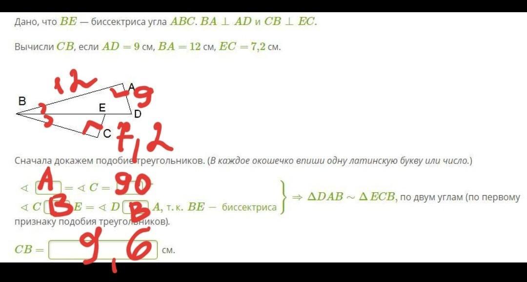 Вычисли CB, если AD= 9 см, BA= 12 см, EC= 7,2 см.