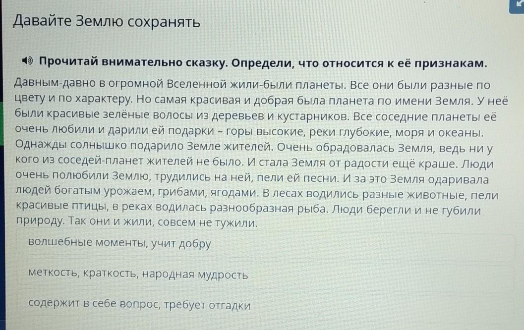 | Прочитай внимательно сказку. Определи, что относится к её признакам.