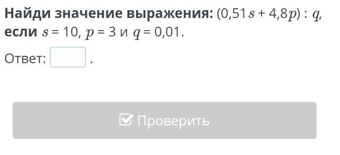 Найди значение выражения: (0,51s + 4,8p) : q, если s = 10, p = 3 и q = 0,01.