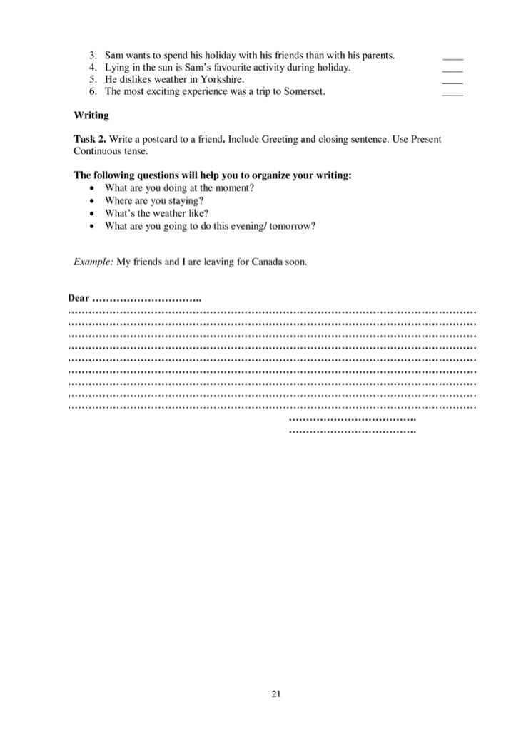 3. Сэм хочет провести отпуск с друзьями, а не с родителями. 4. Лежать на солнце - любимое занятие Сэма во время отпуска. 5. Ему не нравится погода в Йоркшире. 6. Самым захватывающим событием была поездка в Сомерсет. Письменное задание 2. Напишите открытку другу. Включите приветствие и заключительное предложение. Используйте настоящее непрерывное время. Следующие вопросы помогут вам организовать письмо: • Чем вы занимаетесь в данный момент? Где ты остановился? Какая там погода? Что ты собираешься делать сегодня вечером / завтра? Пример: мы с друзьями скоро уезжаем в Канаду. Уважаемый.