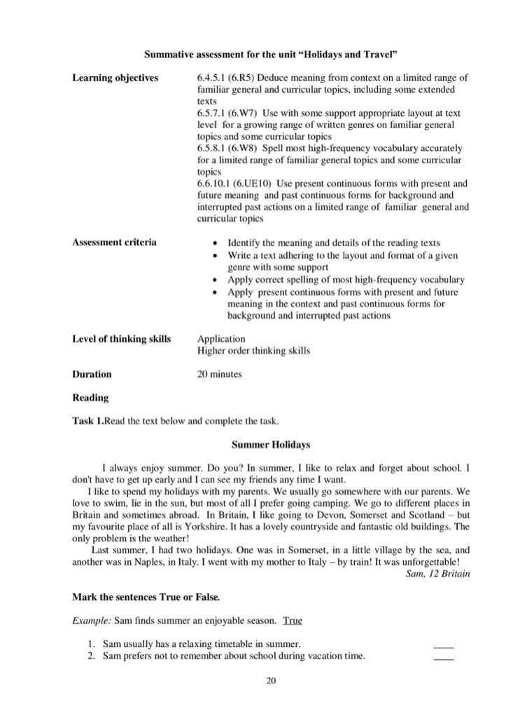 Суммарное оценивание по модулю «Каникулы и путешественник» Цели обучения 6.4.5.1 (6.R5) Вывести значение из контекста на ограниченный круг знакомых общих и учебных тем, включая некоторые расширенные тексты 6.5.7.1 (6.W7) Использовать некоторые изменить подходящую компоновку на уровне текста для растущего числа письменных жанров по знакомым общим темам и некоторым учебным темам 6.5.8.1 (6. W8) Точное написание наиболее часто употребляемой лексики для ограниченного круга знакомых общих тем и некоторых кучевых тем 6.6. 10.1 (6.UEI0) Используйте настоящие непрерывные формы с настоящим и будущим значением и прошлые непрерывные формы для фона и прерванных прошлых действий по ограниченному кругу знакомых общих и учебных тем. Определите значение и детали прочитанных текстов. Напишите текст, придерживаясь макета и формата данного вспре с некоторой миррогностью. Примените правильное написание наиболее часто встречающейся лексики. Просто представьте непрерывную форму с настоящим и будущим смыслом в контексте и прошлом. Непрерывные формы для фона и прерванных прошлых действий. Критерии оценки. Уровень мышления. Приложение. Навыки мышления более высокого уровня. Продолжительность 20 минут. Задание для чтения 1. Прочтите текст ниже и выполните задание. Летние каникулы Мне всегда нравится лето. Ты? Летом мне хочется расслабиться и забыть о школе. не нужно получать ир сarly, и я могу видеться с друзьями в любое время, когда захочу. Хочу провести отпуск с моими родными. Обычно мы куда-то ходим с родителями. Мы любим купаться, лежать на солнышке, но больше всего я предпочитаю походы. Мы ездим в разные места в Великобритании, а иногда и за границу. В Британии мне нравится ездить в Девон, Сотерсет и Шотландию, но мое любимое место - Йоркшир. Он имеет прекрасную сельскую местность и фантастические старые здания. Проблема только в погоде! Прошлым летом у меня было два отпуска. Опе был в Сометсете, в маленькой деревушке у побережья, а еще один был в Неаполе, в Италии. Ехал в Италию на поезде! Это было незабываемо! Сэм. 12 Великобритания Отметьте предложения как истинные или ложные. Пример: Сэм считает лето приятным сезоном. Тпе 1. Летом у Сэма обычно расслабляющее расписание. 2. Сэм предпочитает не вспоминать о школе на каникулах. 20