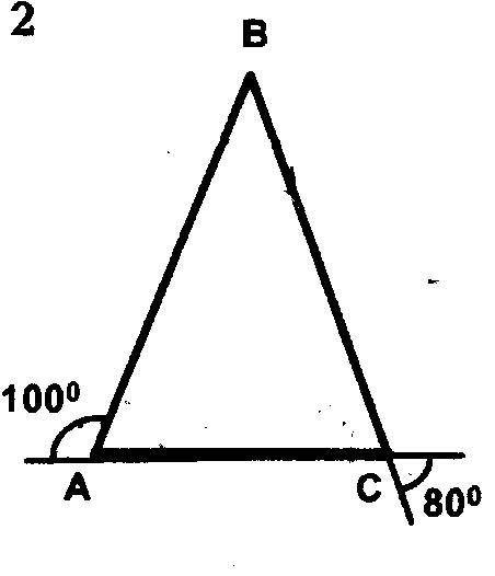 Внутренний угол А треугольника АВС = 180 - 100 = 80 градусов, внутренний угол С = 80 градусов (вертикальные углы), значит, треугольник АВС - равнобедренный (равны два угла). Сумма внутренних углов треугольника 180 градусов, т.е. угол С = 180 - ( 80 + 80 ) = 20 градусов.