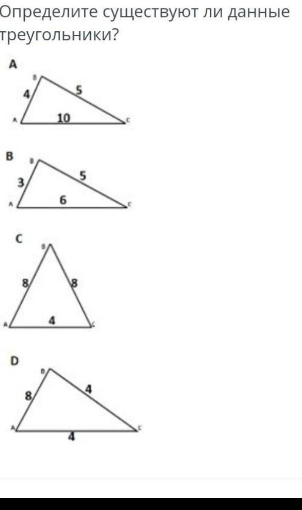 Треугольники А и D не существуют по неравенству треугольников: длина любой стороны треугольника должна быть меньше суммы длин двух других сторон.
