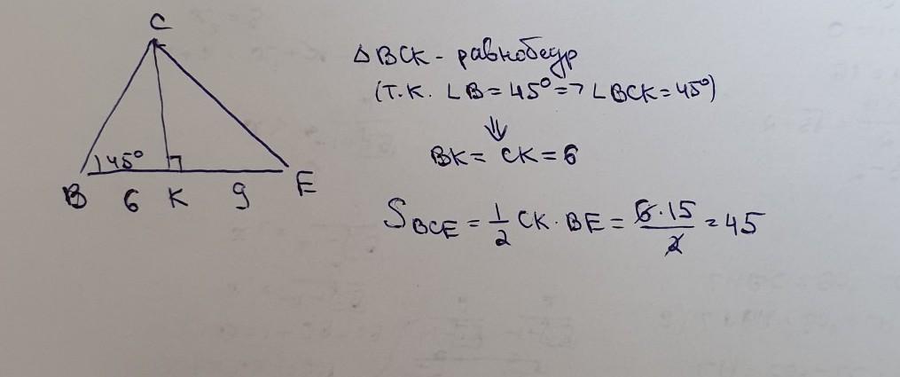 В треугольнике ВСЕ, ∠(В 45° , а высота СК делит сторону ВЕ на отрезки ВК и ЕК соответственно равные 6 см и 9 см. Найдите площадь треугольника ВСЕ.