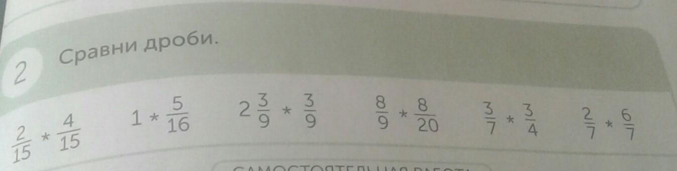 1)2/15больше;1больше;две целых три девятых больше;восемь двадцатых меньше;три седьмых больше;две седьмых больше