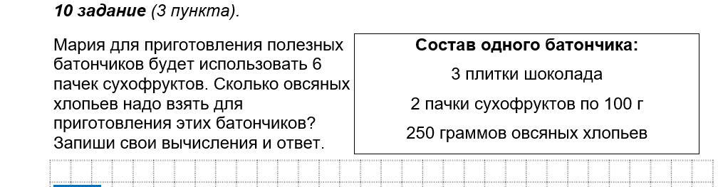 Зная, что Мария приготовит всего 3 полезных батончика, и, что на 1 батончик уходит 250 грамм овсяных хлопьев, мы посчитаем сколько овсяных хлопьев уйдёт на приготовление полезных батончиков 250×3=750 (грамм овсяных хлопьев, которое уйдёт на приготовление полезных батончиков)