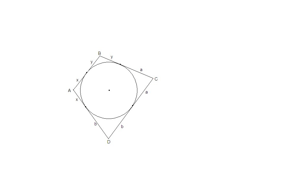 докажите, что у четырехугольника, описанного около окружности, суммы длин противоположных сторон равны