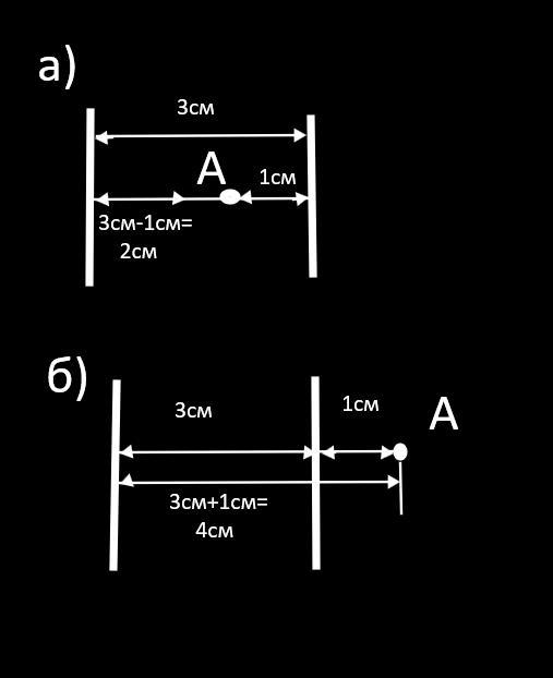 а) если точка А расположена между прямыми, то по рисунку мы легко определяем, что расстояние до второй прямой равно 2 см;