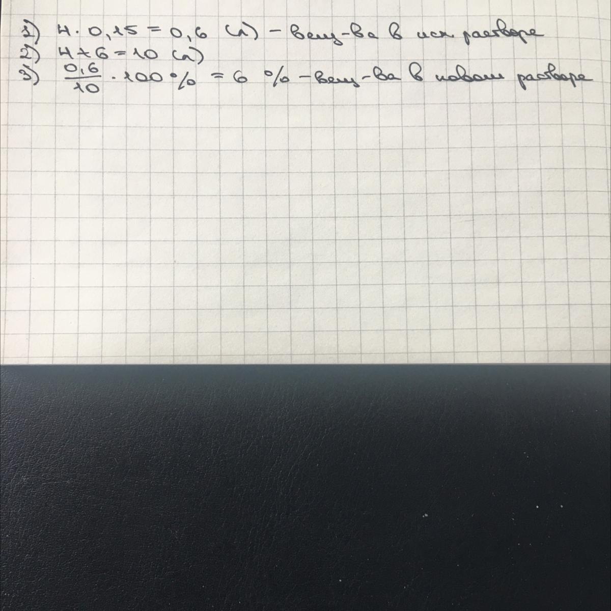 В четырёхлитровый 15-ти процентный водный раствор некоторого вещества добавили 6 литров воды. Сколько процентов составляет концентрация этого вещества в новом растворе?