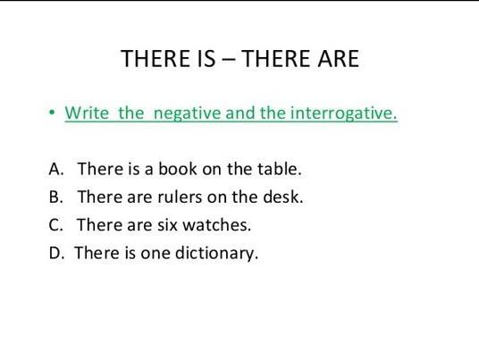THERE IS - THERE ARE Write the negative and the interrogative. A. There is a book on the table. B. There are rulers on the desk. C. There are six watches. D. There is one dictionary.