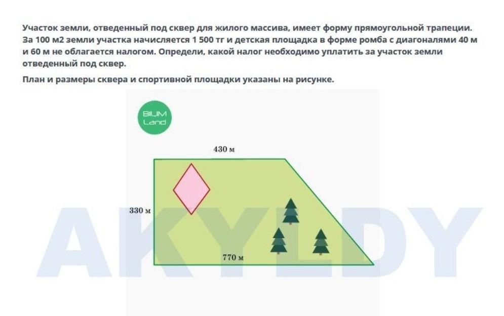 Участок земли, отведенный под сквер жилого массива, имеет форму прямоугольнойУчасток земли, отведенный под сквер жилого массива, имеет форму прямоугольной трапеции. За 100 м2 земли участка начисляется тг и детская площадка в форме ромба с диагоналями 40 м и 60 м не облагается налогом. Определи, какой налог необходимо уплатить за участок земли отведенный под сквер. План и размеры спортивной площадки указаны на рисунке. трапеции. За 100 м2 земли участка начисляется тг и детская площадка в форме ромба с диагоналями 40 м и 60 м не облагается налогом. Определи, какой налог необходимо уплатить за участок земли