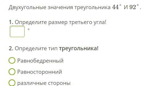 1)180(треугольник) вычесть 2 известных угла = неизвестный угол