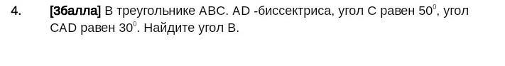 В треугольнике ABC. AD -биссектриса, угол С равен 500, угол СAD равен 300. Найдите угол В.