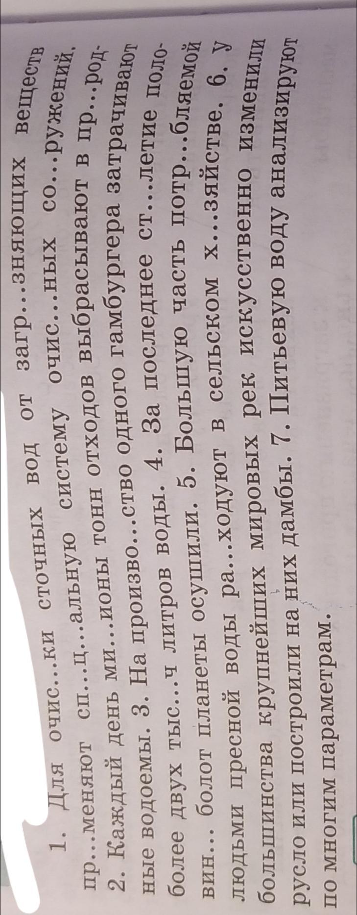 1 Для очистки сточных вод от загрязняющих веществ применяют специальную систему очистных сооружений.2 Каждый день миллионы отходов выбрасывают в природные водоемы.3 На производству одного гамбургера затрачивают более двух тысяч литров воды.4 За последнее столетие половину болот планеты осушили.5 большую часть потребляемой людми пресной воды расходуют в сельском хозяйстве.6 У большинство крупнейших мировых рек искусственно изменили русло или построили на них дамбы питьевую воду анализирует по многим параметрам.
