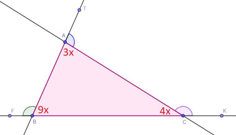 Розв'язання: Введмо коефіцієнт пропорційності x, тоді кут ∠BAC = 3x, ∠BCA = 4x, ∠ABC = 9x. За теоремою суміжний кут дорівнює сумі двох кутів не суміжних з ним, тоді: