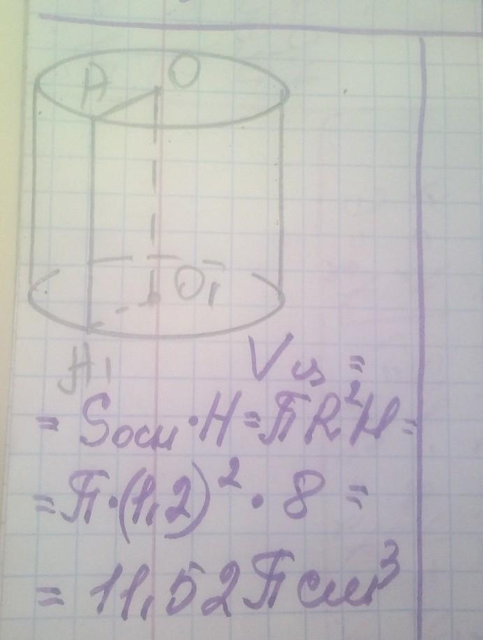 знайти об'єм циліндра,радіус якого дорівнює 1,2 см, а висота 8 см