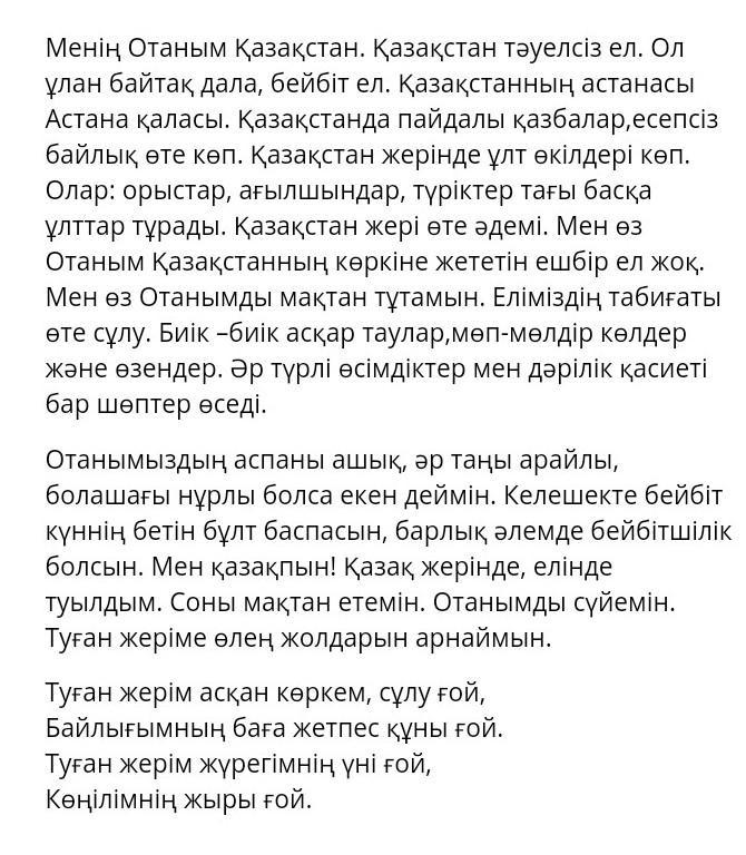 Ия, әркімнің өз туған жері-жұмағы. Менің кіндік қаным тамған жер, ұлы дала, байтақ ел-Қазақстан. Мен елімді шексіз сүйгендіктен жүрегімнің соңғы дүрсіліне дейін туған далама адал қызмет еткім келеді. Ұлы даралар салған жолмен жүріп туған тілімізді ,дінімізді, сан мыңдаған тарихымызды танып білу үстіндеміз. Осы күнге дейін біз қаншама ірі жобаларды жүзеге асырдық, рухани жаңғыру аясында EXPO-2017 ұлттық көрмесін қою мәртебесі Қазақстанға бұйырды, енді айта берсек өте көп. Биыл 2019 жыл елімізде жастар жылы деп аталғаны барлығымызға мәлім. Осыған байланысты дарынды да өнерлі жастарымыз өз ұсыныстарын ортаға салды және қазірде ірі белестерді бағындыру үстінде. Жақында Америка елінде”The World’s Best”атты әйгілі жоба құрылып, әлемнің түкпір-түкпірінен жиналған өнерлі жастар бақ сынасты. Сол жобаға елімізден бұлбұл дауыс иелері Димаш Құдайберген, Данэлия Тулешова да қатысты. Бір қуантарлығы бұл екі әнші де ақтық байқауға жолдама алды Мінекей, еліміз жеткен жетістіктер қаншама. Күн санап еліміз жаңғыру үстінде. Қазақстанның тұңғыш президенті Нұрсұлтан Әбішұлы Назарбаев осы жылда өз орнын босатуға шешім қабылдады және елбасы міндетін Қасым Жомарт Тоқаевқа үлкен сеніммен тапсырды. Жаңа президентіміз Астана қаласын Нұр-Сұлтан деп өзгертетінін хабарлады. Қазақтың ақиық ақыны Мұқағали Мақатаев жырлағандай