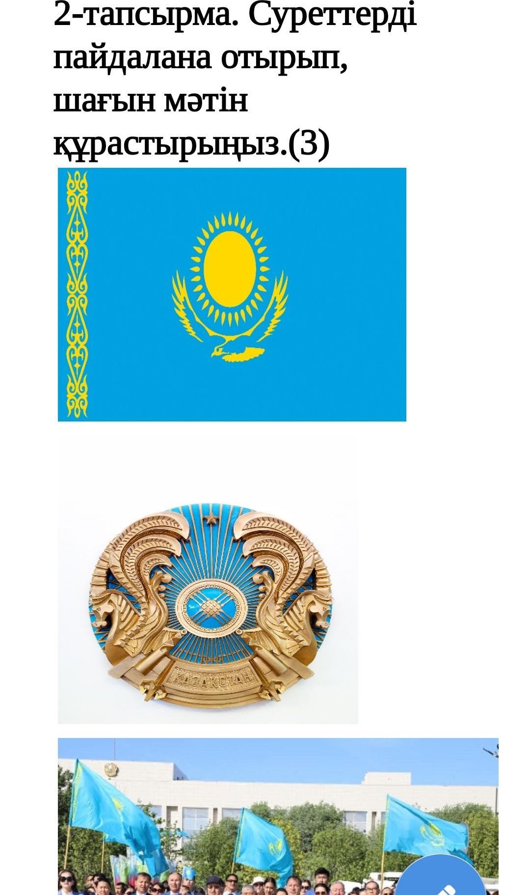 Менің туып, өскен жерім –Егемен ел Қазақстан. Қазақстан тәуелсіз, жері кең, ұлан байтақ, егеменді ел.Елтаңбада шаңырақ, қос пырақ, жұлдызша және «Қазақстан» деп жазылған таңба бар.Туда бейнеленген көк түс-көгілдір және ашық аспанымыз, ал, қыран біздің бейбіт, самғап ұшып жүрген бостандығымыздың бейнесі.