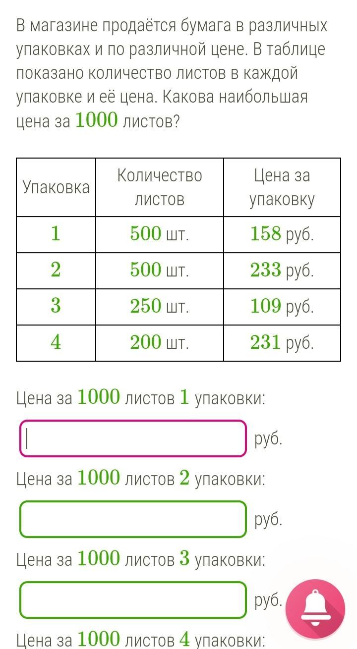 В магазине продаётся бумага в различных упаковках и по различной цене. В таблице показано количество листов в каждой упаковке и её цена. Какова наибольшая цена за 1000 листов?
