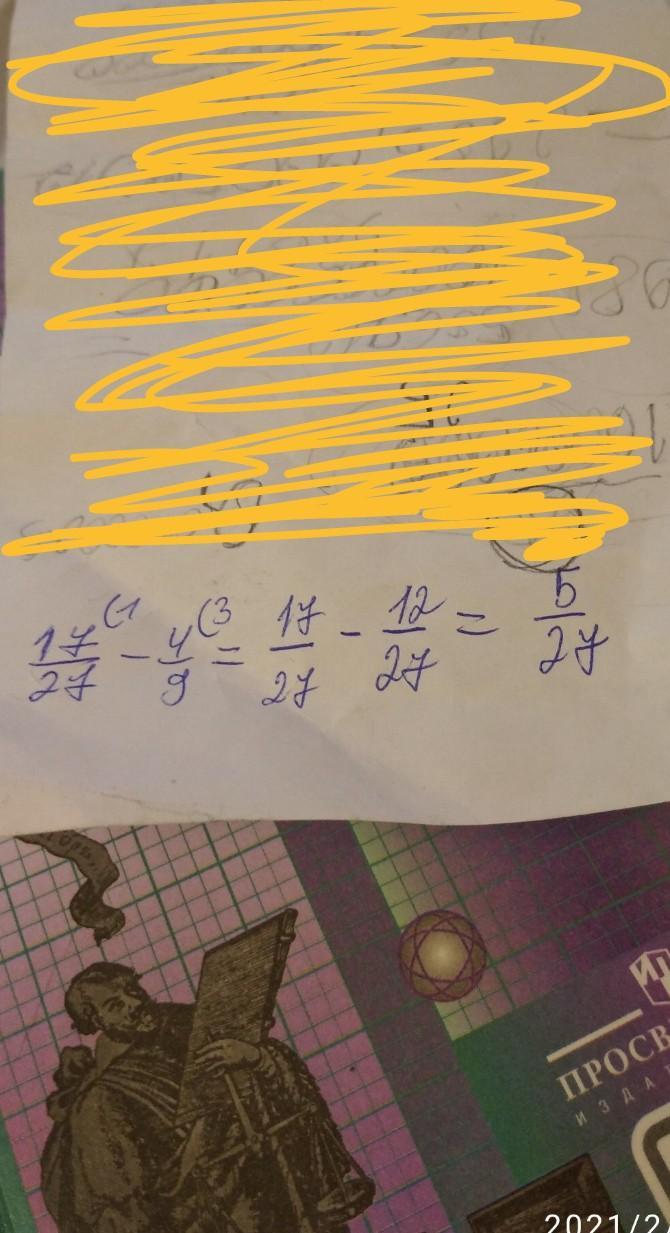 17/27 - 4/9 = (17 - 4×3)/27 = 5/27.
