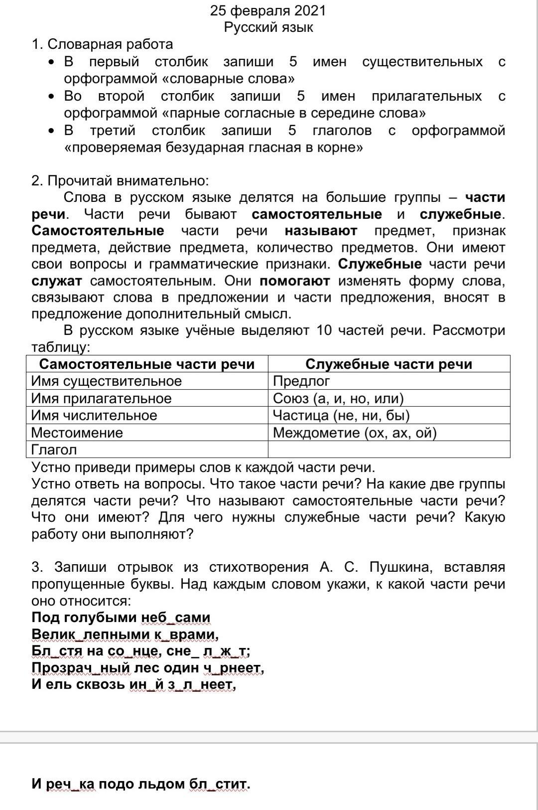 Над каждым словом укажи, к какой части речи оно относится.