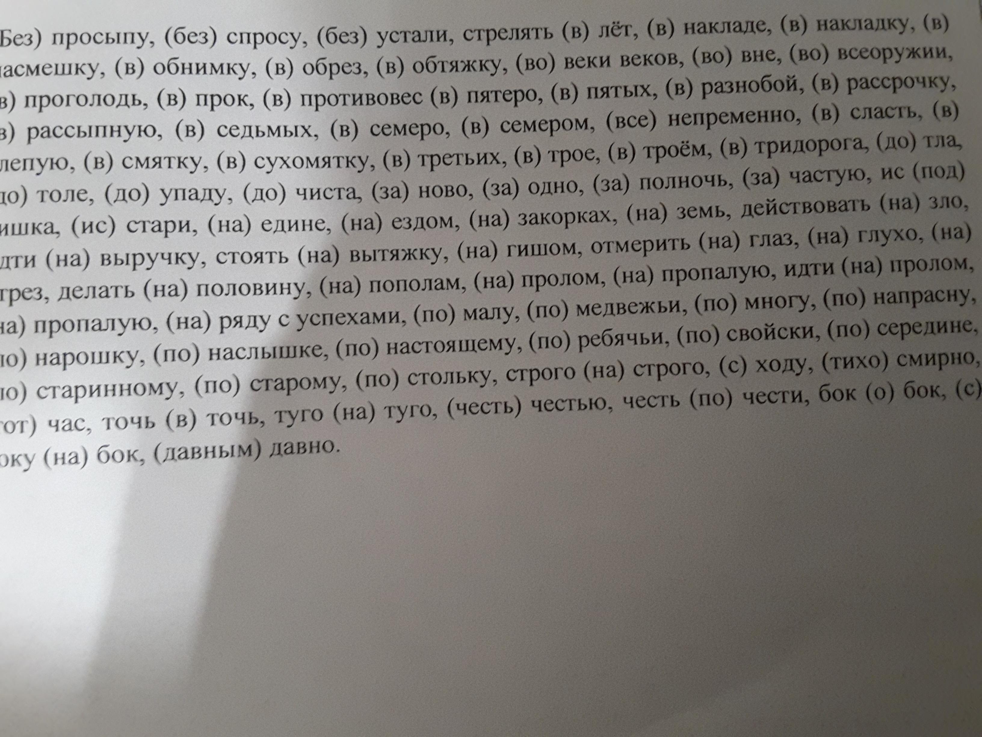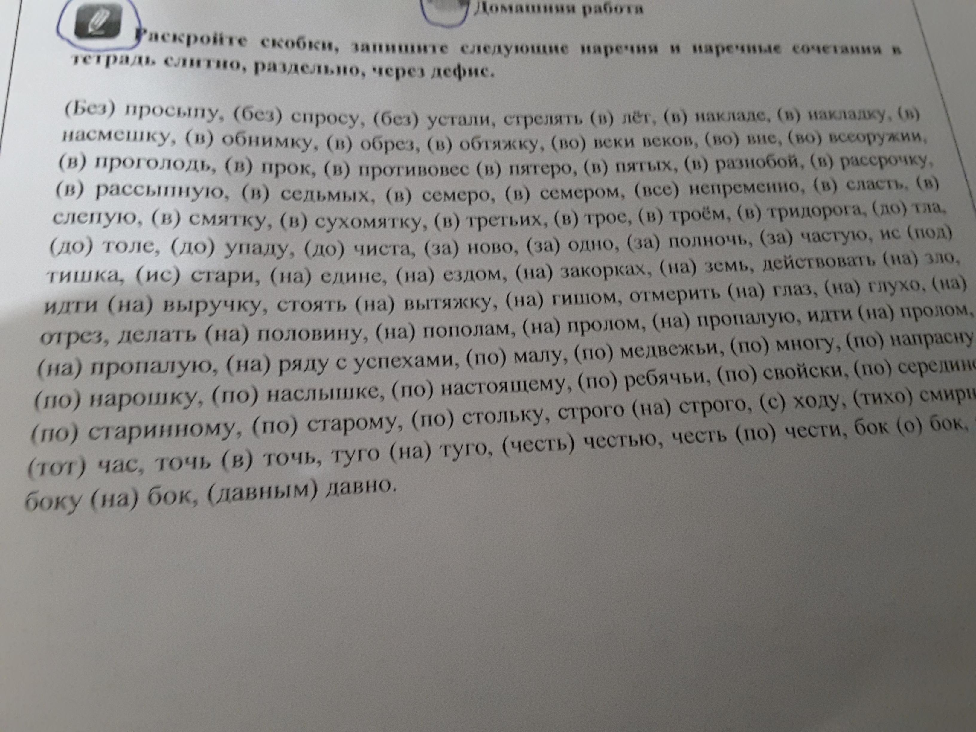 без просыпу, без спросу, без устали, стрелять влёт, в накладе, внакладку, в насмешку, внатяжку, вничью, в обнимку, в обрез, в обтяжку, во веки веков, вовне, во всеоружии, вовсю, во-вторых, в одиночку, впервые, воистину, волей-неволей, в отместку, вполнакала, вполоборота, вправду, вправе, вприглядку, вприсядку, впритирку, впроголодь. впрок, в противовес, впрочем, впустую, впятеро, в-пятых, вразнобой, в рассрочку, врассыпную, в-седьмых, всемеро, всемером, всенепременно, всласть, вслепую, всмятку, всухомятку, в-третьих, втрое, втроём, втридорога, в упор, вхолостую, досуха, дотемна, дотла, дотоле, до упаду, дочиста, заново, заодно, заполночь, зачастую, исподтишка, исстари, накрест, крест-накрест, стоять навытяжку, наперебой, на глаз, наглухо, разбить наголову, на-гора, наготове, надвое, на диво, надолго, наедине, наездом, на закорках,наземь, действовать назло, идти на выручку, стоять навытяжку, нагишом, отмерить на глаз, наглухо, наотрез, наперебой, наперерез, с ружьём наперевес, наперечет, на побегушках, наповал, делать напоказ, делать наполовину, напополам, напролом, напропалую, напрочь, наравне, на попятную, на поруках, направо, напрокат, день напролет, идти напролом, напропалую, наряду с успехами, насилу избавился, на скаку, насквозь, на редкость скучный, помалу, по-медвежьи, помногу, понапрасну, понарошку, понаслышке, по-настоящему, поначалу, по-нашему, поневоле, понемногу, дым стелется понизу, по-нынешнему, поодиночке, по-осеннему, поочередно, пополудни, по-прежнему, по-пустому, попусту, по-ребячьи, по-свойски, посередине, по-старинному, по-старому, постольку, по-человечески, снизу доверху, снова, сослепа, спереди, спозаранку, справа, с разбега, строго-настрого, сходу, тихо-смирно, тотчас, точь-в-точь, туго-натуго, честь-честью, честь по чести, бок о бок, с боку на бок, давным-давно.
