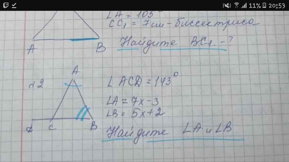 2)(7x-3)+(5x+2)=143°(власт.внешнего куьа);7x-3+5x+2=143;12x=143+3-2;12x=144;x=144÷12;x=12;кут А=7×12-3=81° В=5×12+2=62°