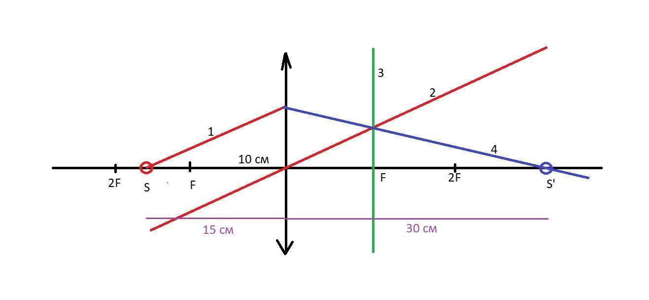 фокусное расстояние тонкой собирающей линзы равно 10 см на главной оптической оси этой линзы покоится святящаяся точка расположенная на расстоянии 15 см от линзы постройте изображение данной точки