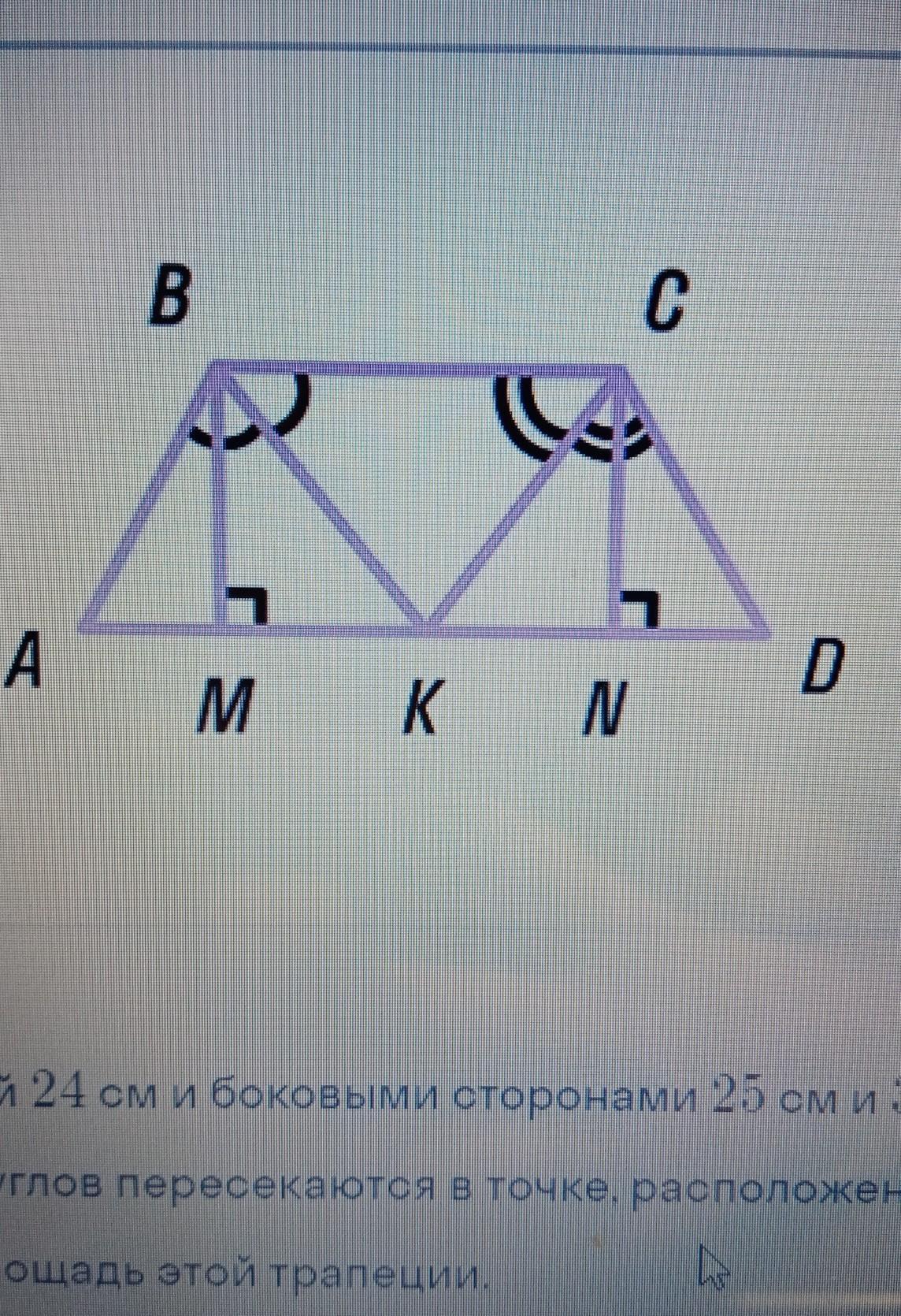 в трапеции с высотой 24см и боковыми сторонами 25 и 30см биссектрисы тупых углов пересекаются в точке, расположенной на большем основании. найди площадь трапеции