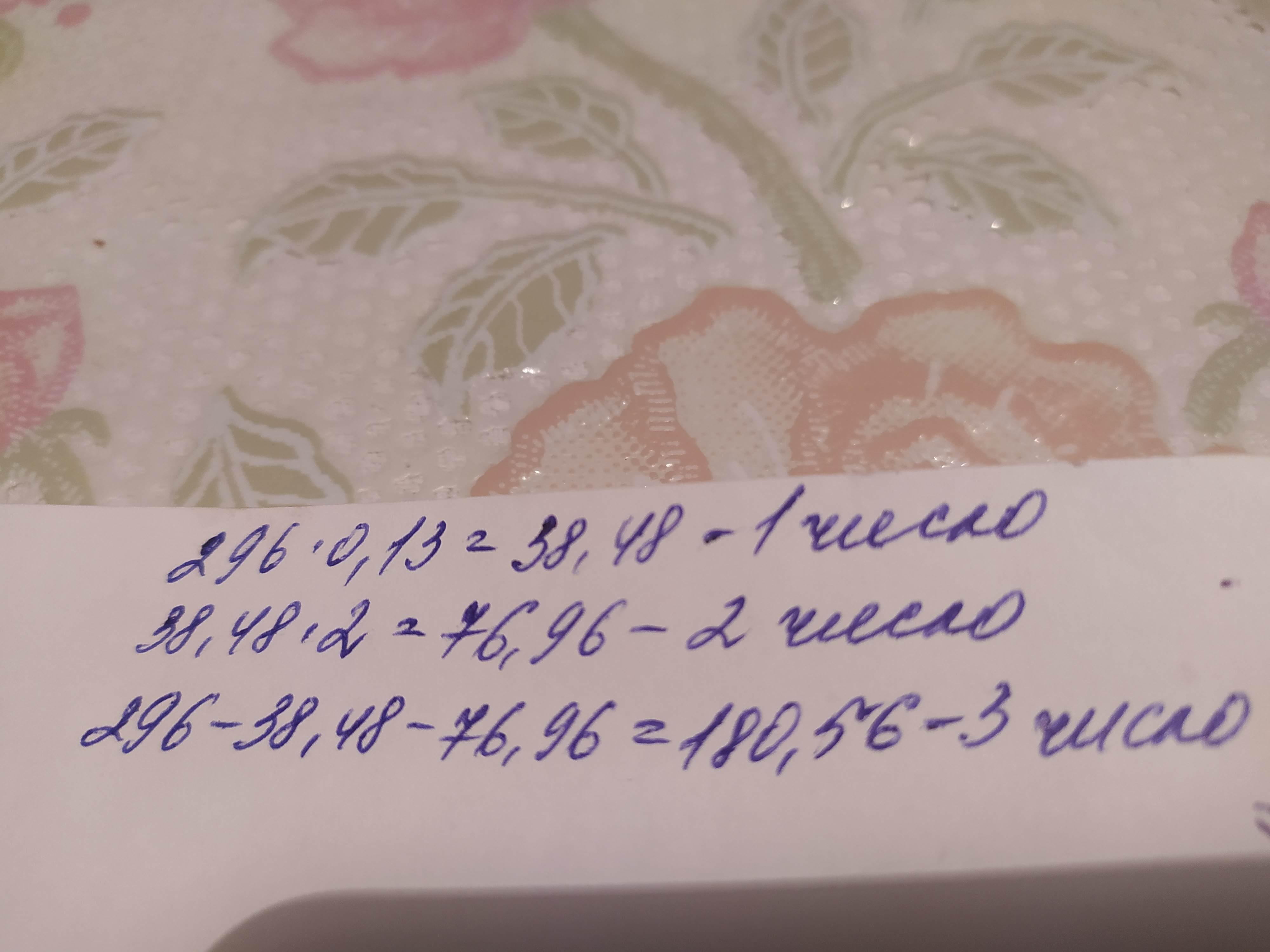 Сумма трёх чисел равна 296. Первое число составляет 13 % этой суммы. Второе число в 2 раза больше первого. Найди третье число
