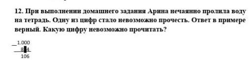 при выполнении домашнего задания Арина нечаянно пролила воду на тетрадь одну из цифр стала невозможно прочесть ответь в примере Какую цифру невозможно прочесть 1000 - 8 Неизвестная цифра 4 равно 106