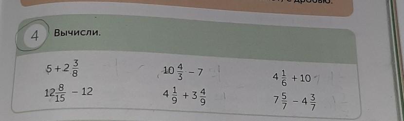 1) 7 3/8, 2)3 4/5, 3) 14 1/6, 4) 8/15, 5) 7 5/9, 6)3 2/7.